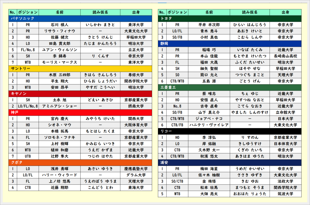 580 リーグワン2024-25 Div.1 2025年卒・新加入選手一覧
