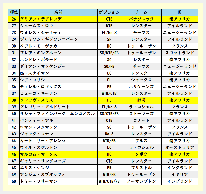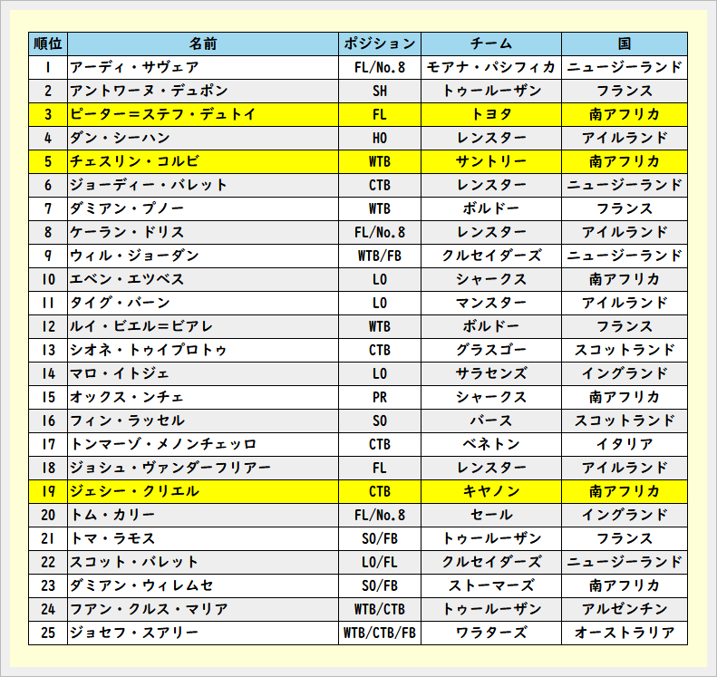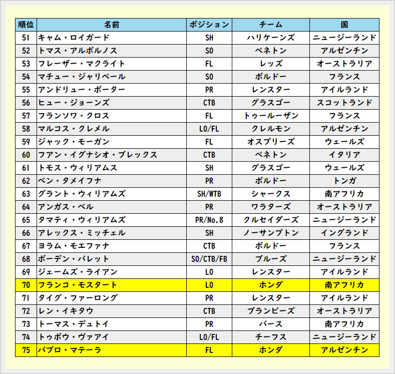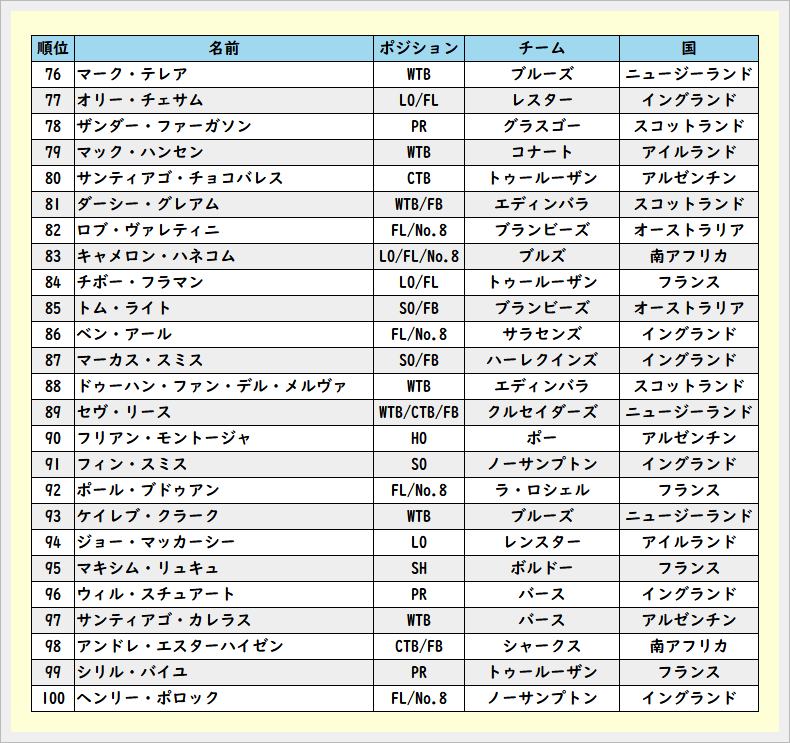 2025年度のラグビー選手TOP100