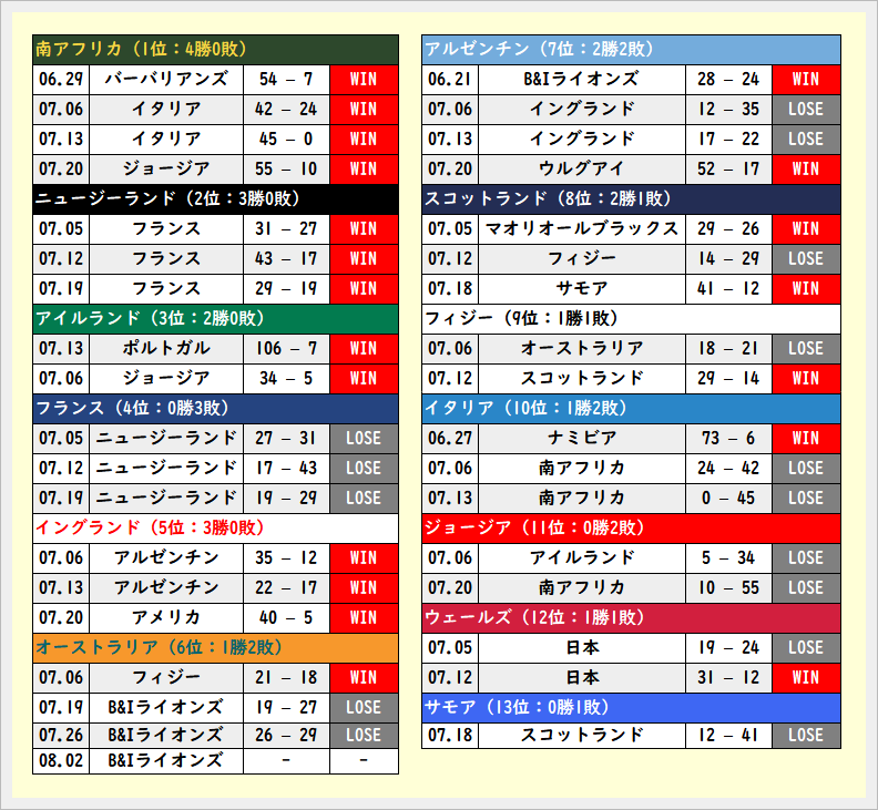 本日現在までの初夏のテストマッチの結果です。