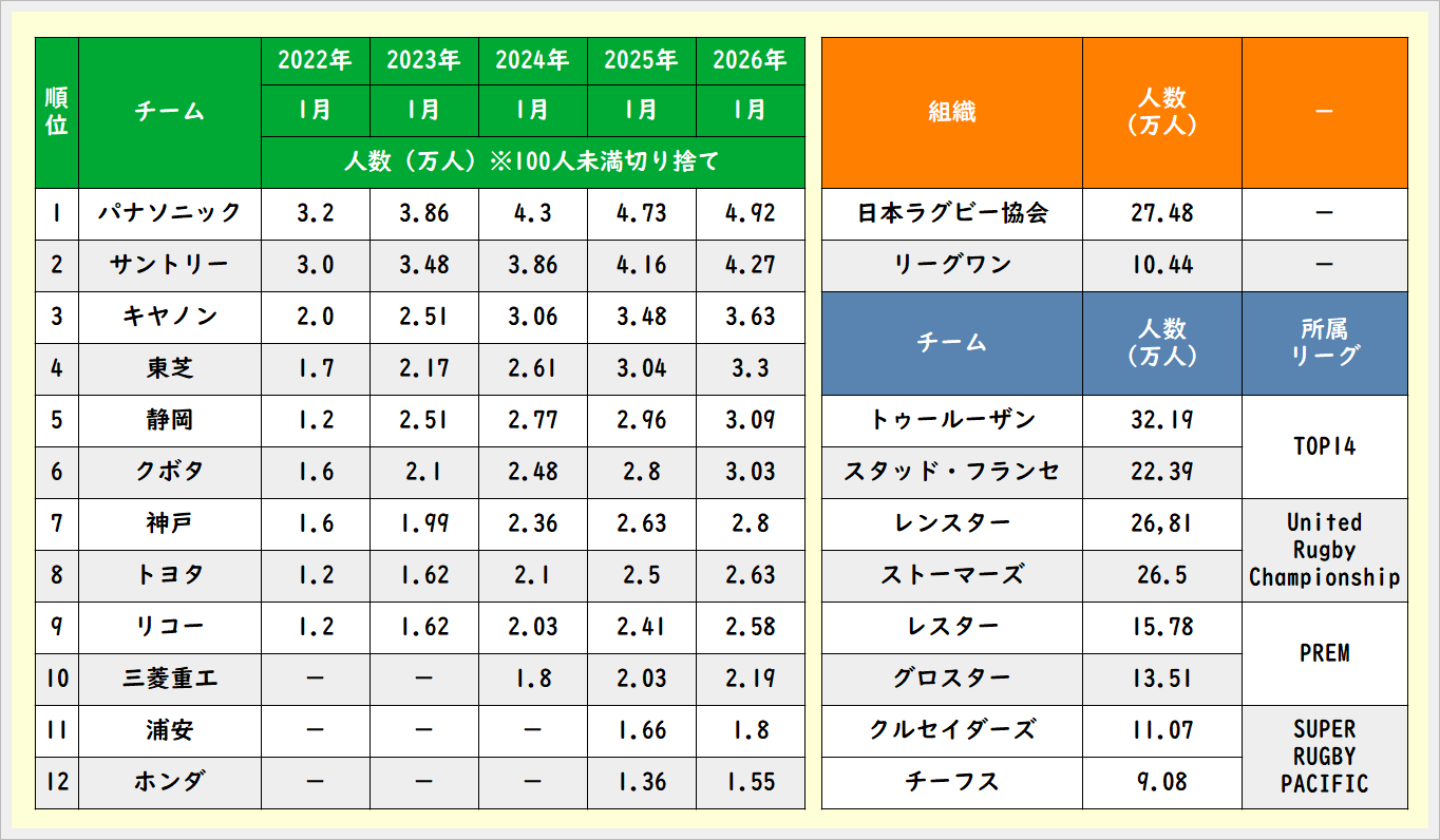 リーグワン開始時期からの数値と、海外リーグの人気チームの数値等と合わせてまとめてみましたので、ご参考まで。