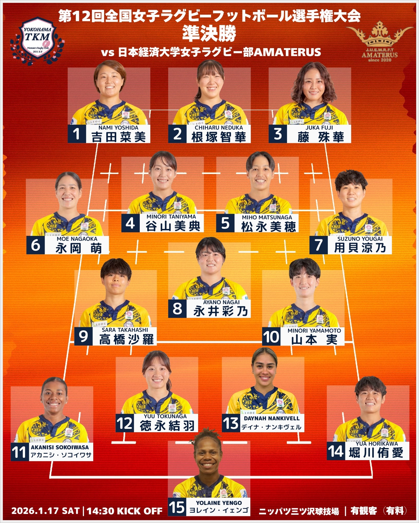 誰が先発しても遜色ない程に選手層を厚くしてきたTKMだが、明日の先発はよくよく見ると、約2か月前にアルテミと戦った時と全く同じだ。前回の対戦を意識したのかもしれない。ちなみに関東大会、全国大会とFBで出場した内海は、キャプテンとしてセブンズのシンガポール大会に出場するため欠場。