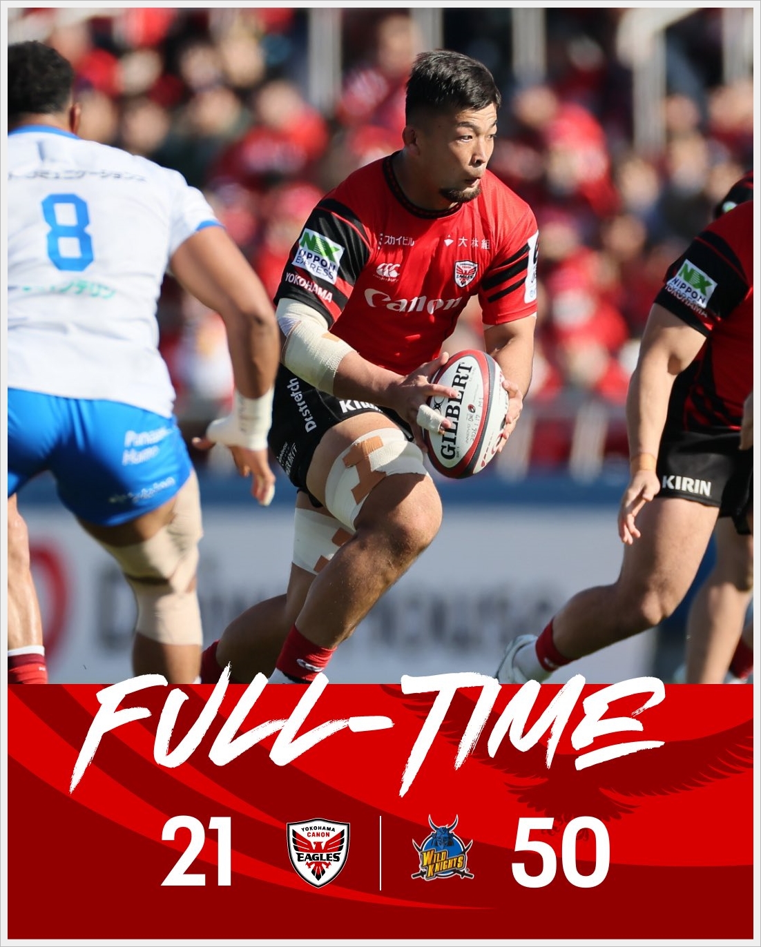 キヤノンのアタックが神戸ディフェンスを何度もブレイクした。神戸のタックル成功率は今季最低の69%だった。その中心はFB武藤だった。