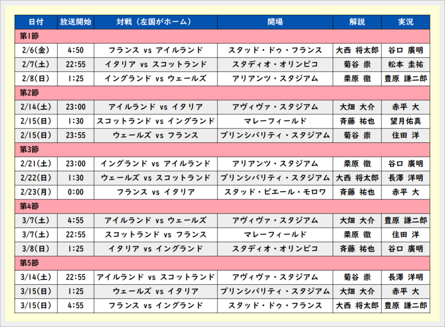 W杯を除く北半球最大の大会、シックスネーションズの開幕が近づいてきました。また寝不足の日々が続きますね。放送・配信は勿論、我らがWOWOW様。放送スケジュールをまとめましたので、ご参考まで。