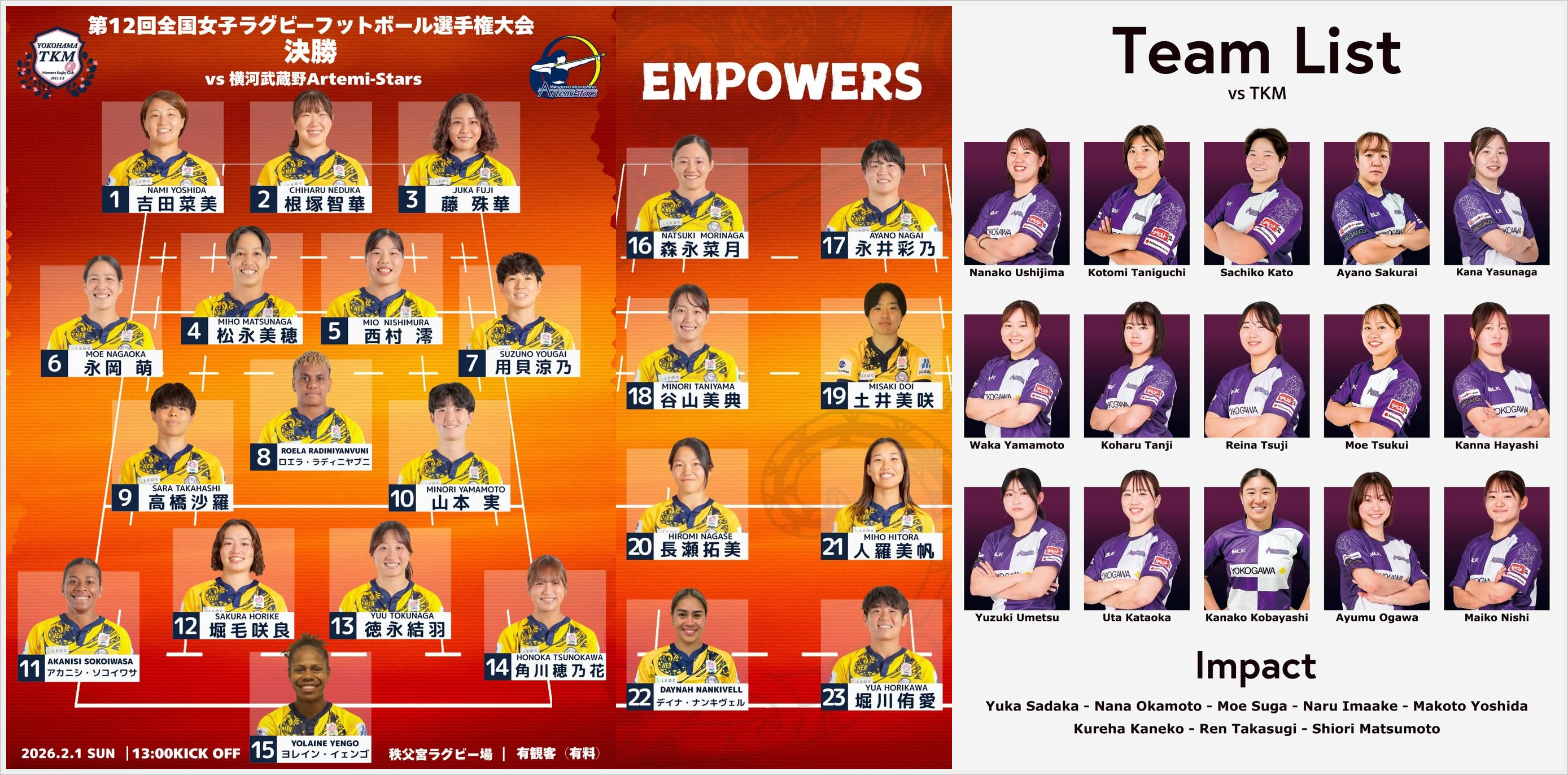 関東大会での戦いの結果は恐らく参考にならないだろう。あれからYOKOHAMA TKMは関東大会チャンピオンとしての自信とプライドを、アルテミは関東大会、全国大会でフェニックス、日体大、PEARLSとの強豪に苦しみながら勝ち上がったチーム力とマインドセットを、それぞれ上積みしているはずだから。