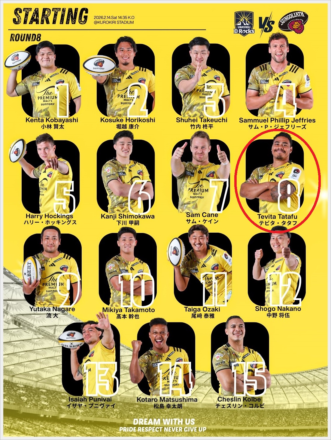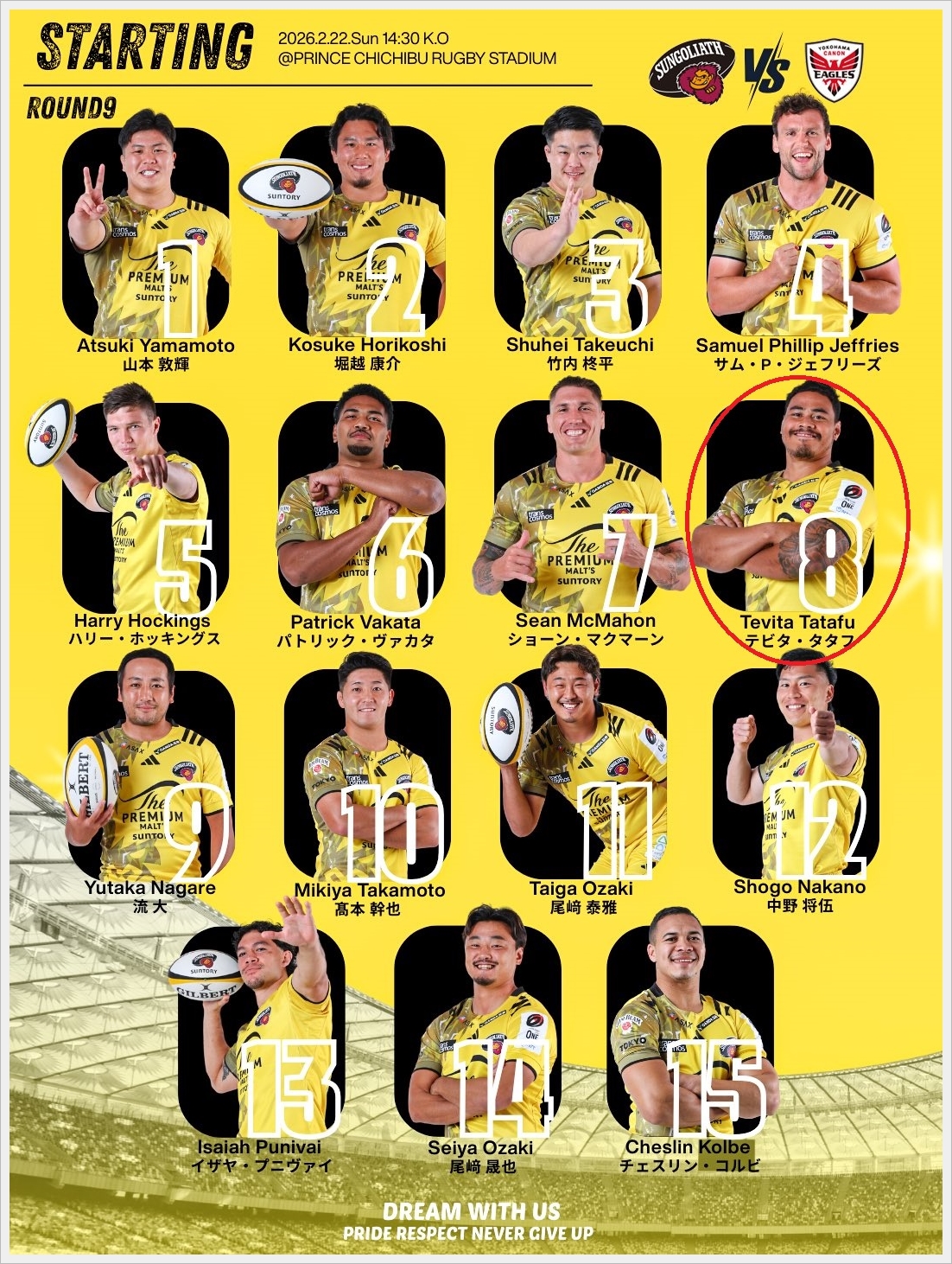タタフはタックルやラックのサポート、ボールを継続・活かす細かいプレーなど、TOP14でも評価を受けた下働きプレーは良かったと思います。肝心のキャリーは、必ずタックラーが2人以上いるので仕方ないですね。ただゴール前の突進は流石です。最初のCTB中野のトライのきっかけはタタフの突進からですから。トライも獲ったし個人的には満足です。