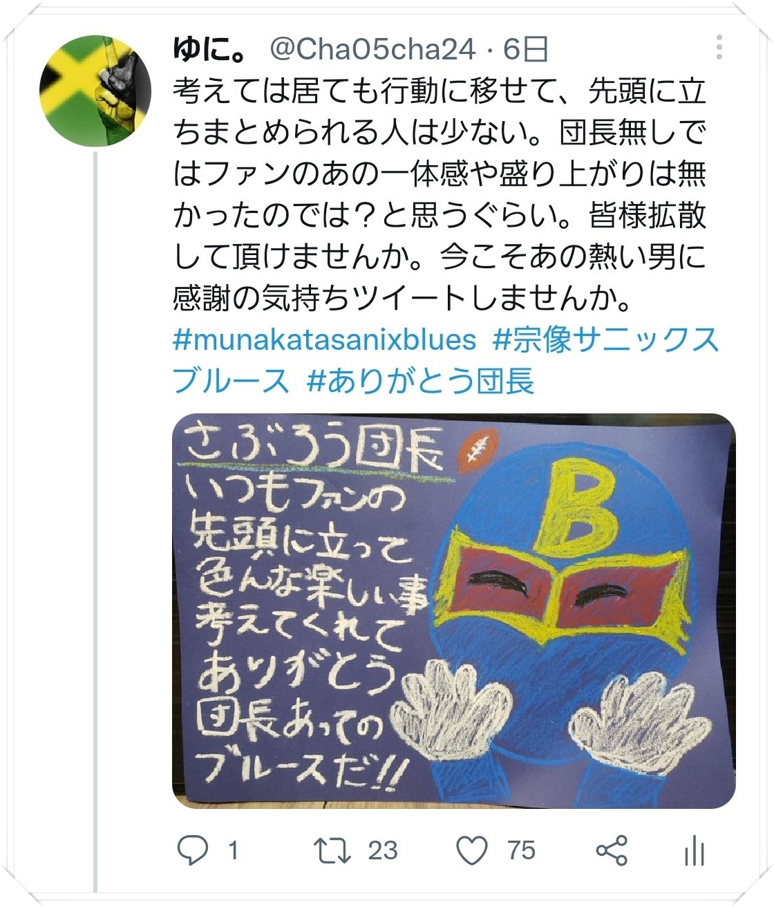 さぶろう団長へのありがとうの想いを23RT、75いいね分届きますように☆。.:*・゜