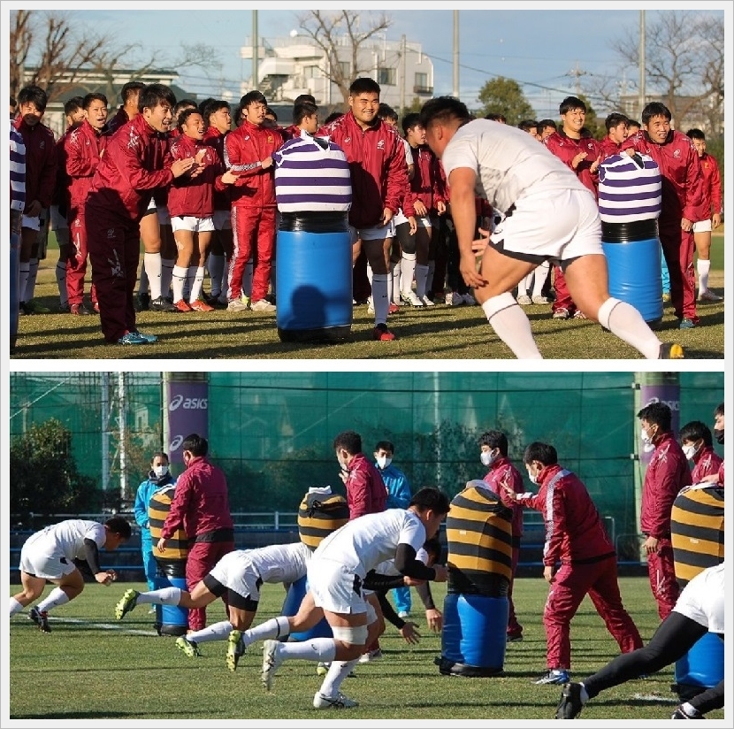 練習最後はメンバー外の選手が拍手で見守る中、大声で相手のジャージを着せたタックルダミーに体をぶつけて練習を締める(泣いてる選手もいる)