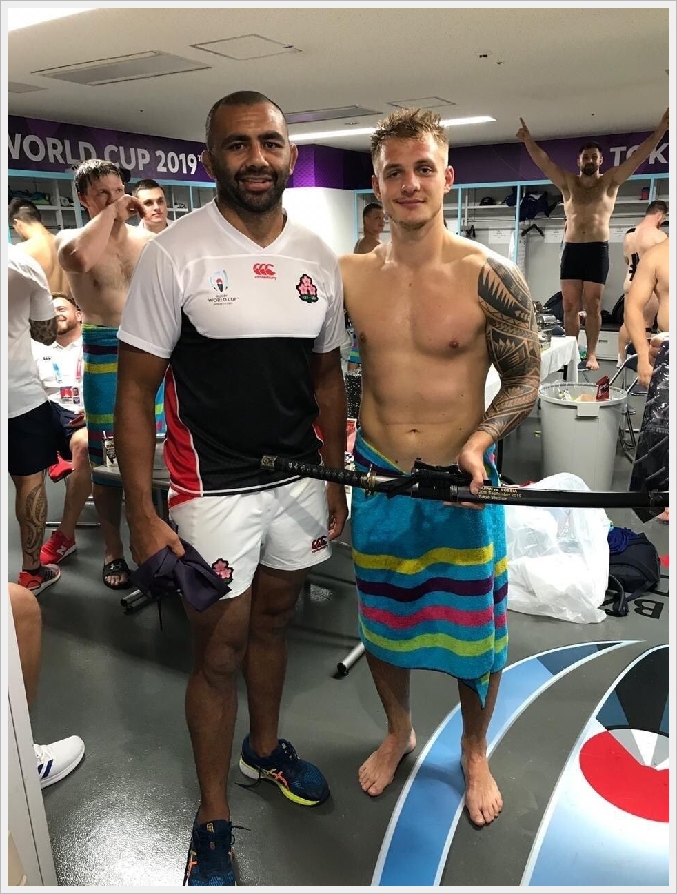 2019W杯 日本vsロシア戦後、リーチはロシアのロッカールームを訪れ、日本代表選手たちが選んだMOMのキリル・ゴロスニツキー(先制トライをあげた選手)に日本刀をプレゼントしました
