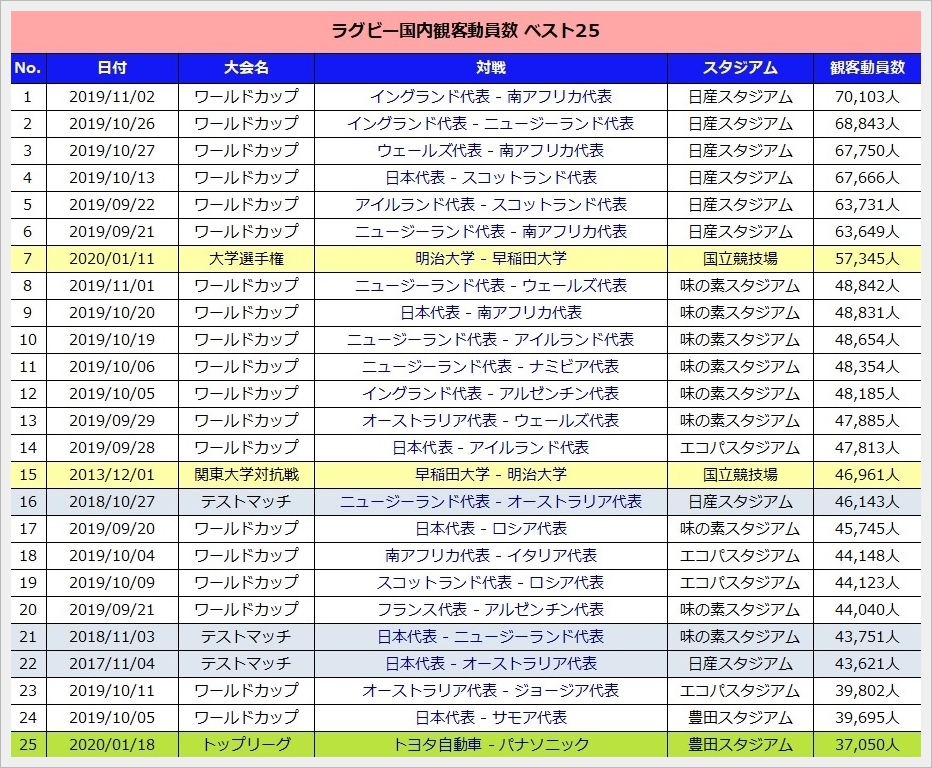 歴代の日本国内のラグビー観客動員数をランキングしてみました。