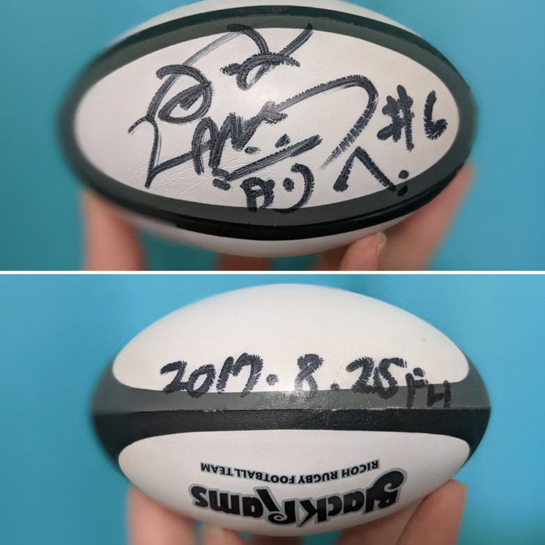 ハイランダーズと言うかマオリオールブラックスのアッシュ・ディクソンのサインボールです。2018年にパナに来てたときのです