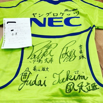 NECグリーンロケッツの若手YouTube軍団ヤングロケッツ、初期メンバー4人のサイン入りシャツです。登録者1000人感謝企画の抽選で当選しました。中嶋選手からのお手紙つき
