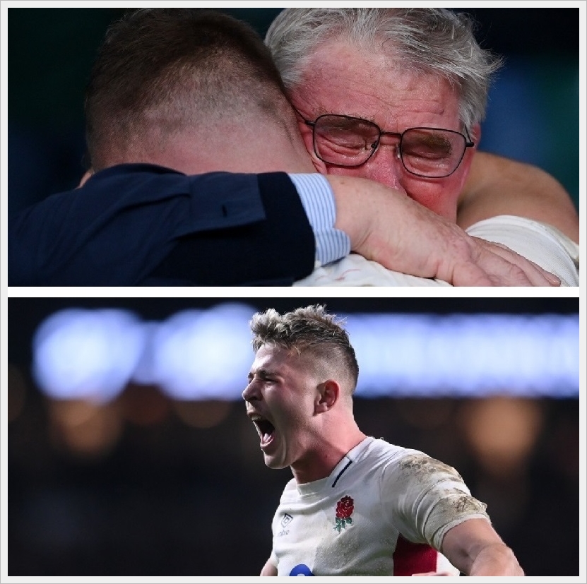18分にトライを決めたイングランドのFBフレディ・スチュワードと彼のおじいちゃんです。