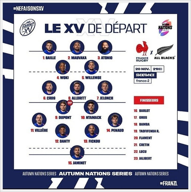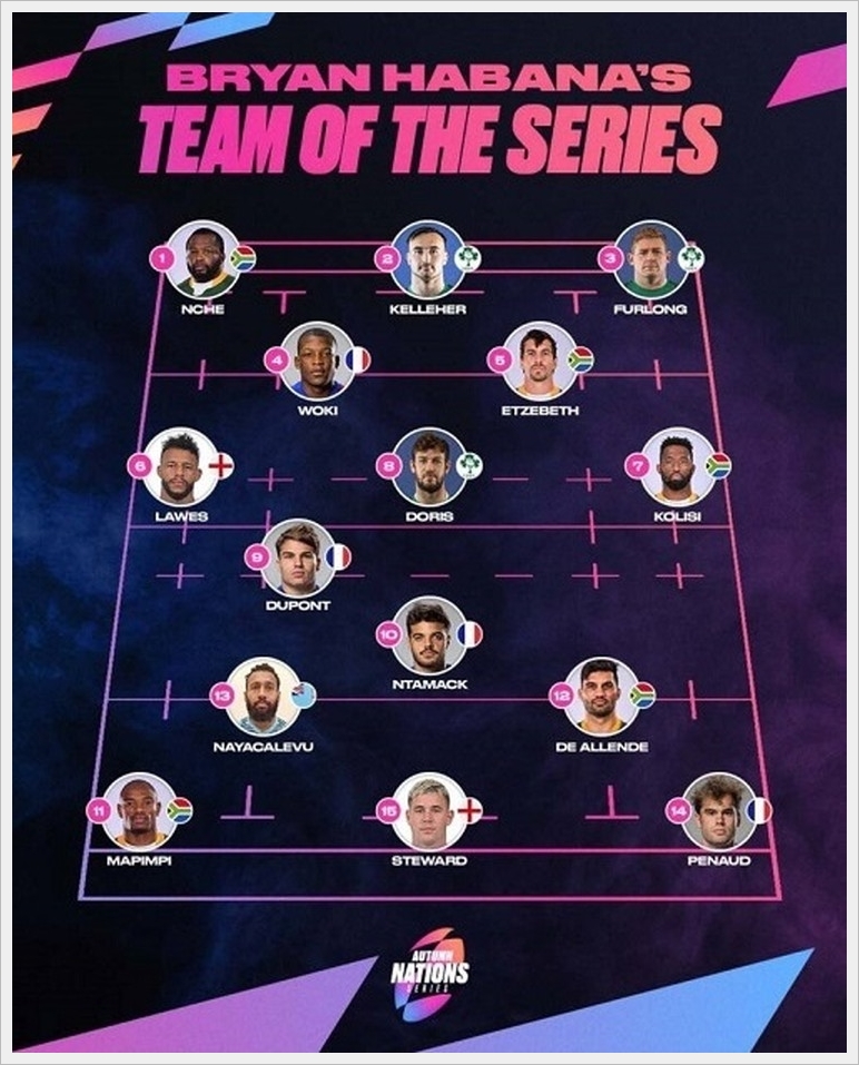 ちなみに元南アフリカ代表のブライアン・ハバナさんがオータム・ネーションズ・シリーズの公式HPで、 シリーズのベスト15 を発表してたのを見たら、フランスからはウォキ、デュポン、ヌタマック、プノーの4人が選ばれてて、オールブラックスからは1人も選ばれてなかったよ。