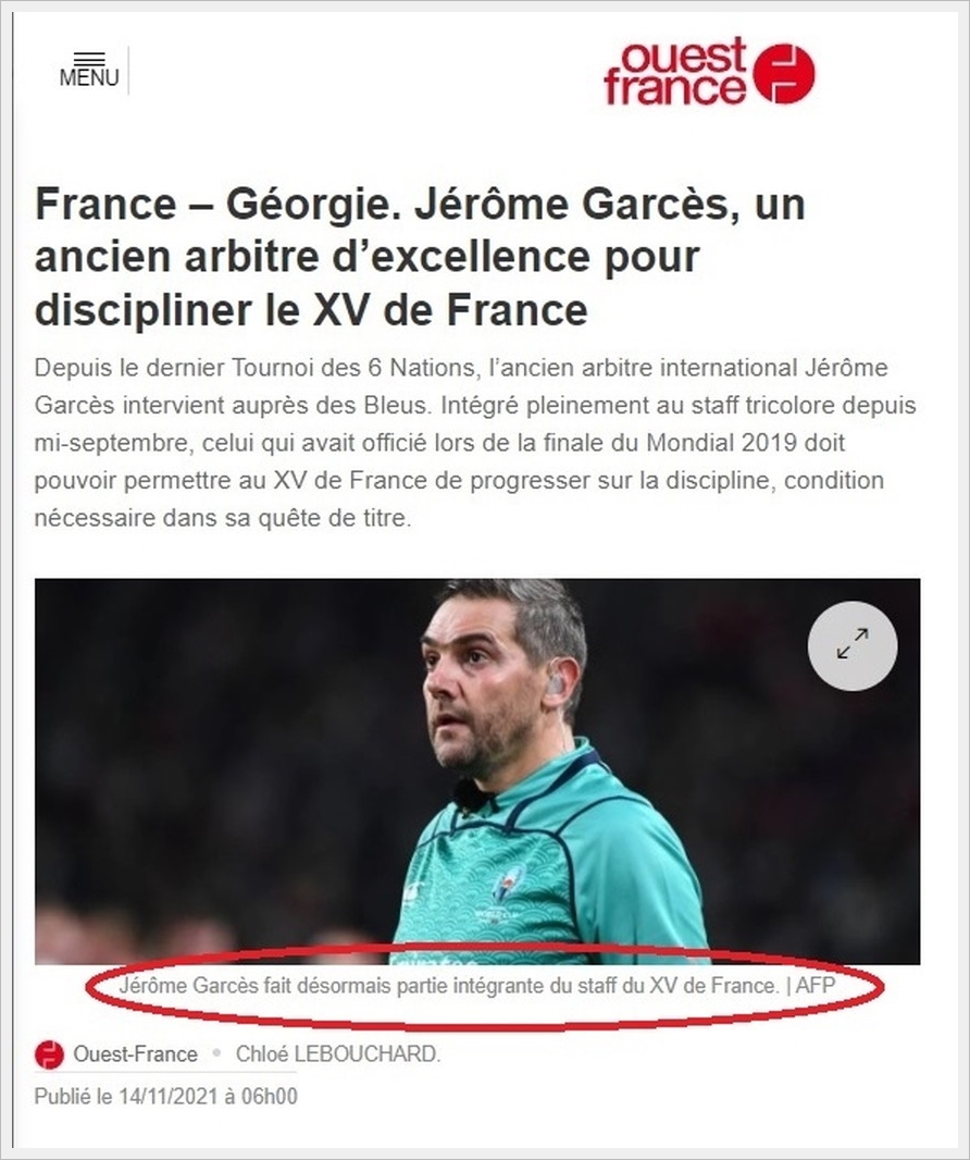 これは11月21日の記事。写真の赤丸で囲んだところを訳すと「ジェローム・ガルセスは現在、フランス代表のスタッフに不可欠です。」だって。やっぱりフランス代表の専属レフェリーとしてチームに帯同してるみたい。多分ディシプリン担当コーチのような形で活動しているんだろうね。