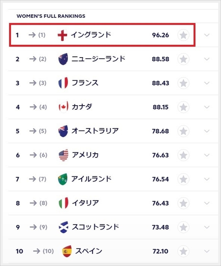 レッドローズは2位のブラックファーンズ(ニュージーランド)に大差をつけてダントツの1位です。この差はちょっとやそっとではひっくり返らないくらいの大きな差です。