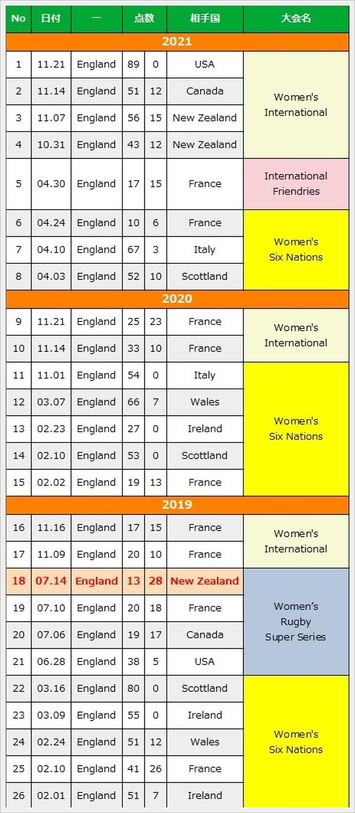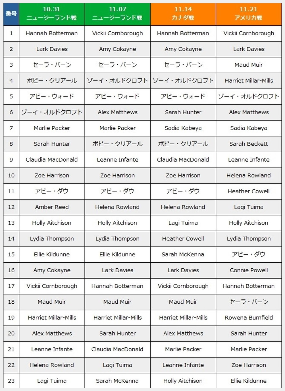 レッドローズの場合、代表スコッドに選ばれているメンバーであれば誰が試合に出場しても遜色のない働きをしてくれますが、強いてキーメンバーを選ぶとすると、上記のニュージーランド戦(左の2試合)に先発したメンバーは特に力があります。