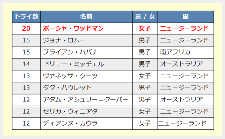 さらに準々決勝で2トライを重ねその記録を20に伸ばしました