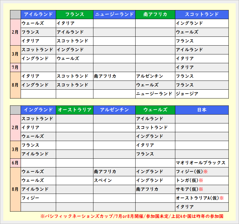 WORLD RUGBY掲載のW杯までの各国テストマッチ予定
