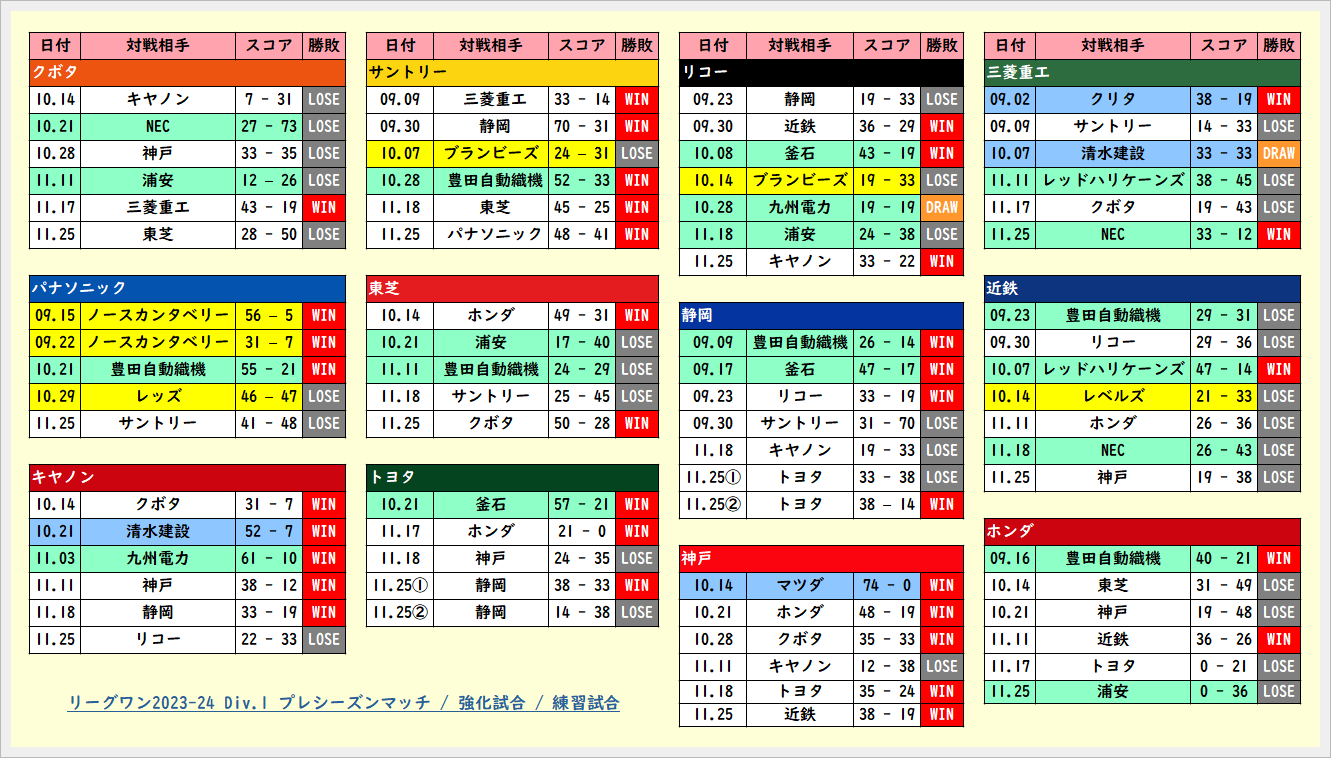 465 リーグワン2022-23 Div.1 プレシーズンマッチ結果一覧