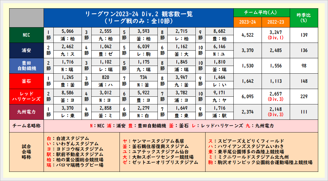 500 リーグワン2023-24 Div.2 リーグ戦観客数一覧