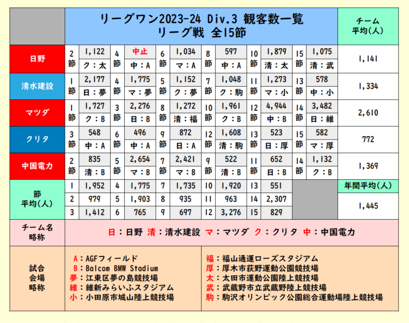 リーグ戦4位のマツダリーグ戦3位とクリタで観客数に3.4倍の差が開いてしまいました