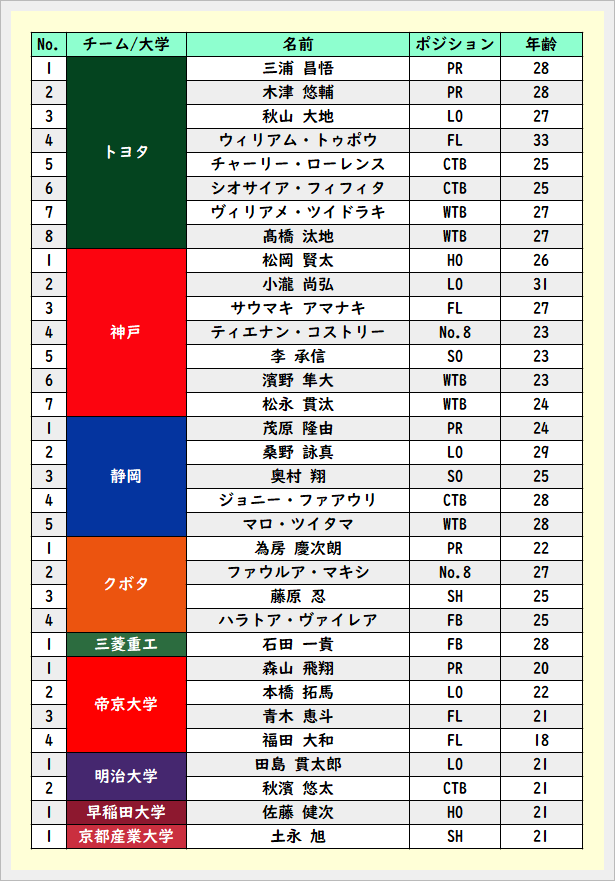 518 トレーニングスコッド菅平合宿 参加メンバー