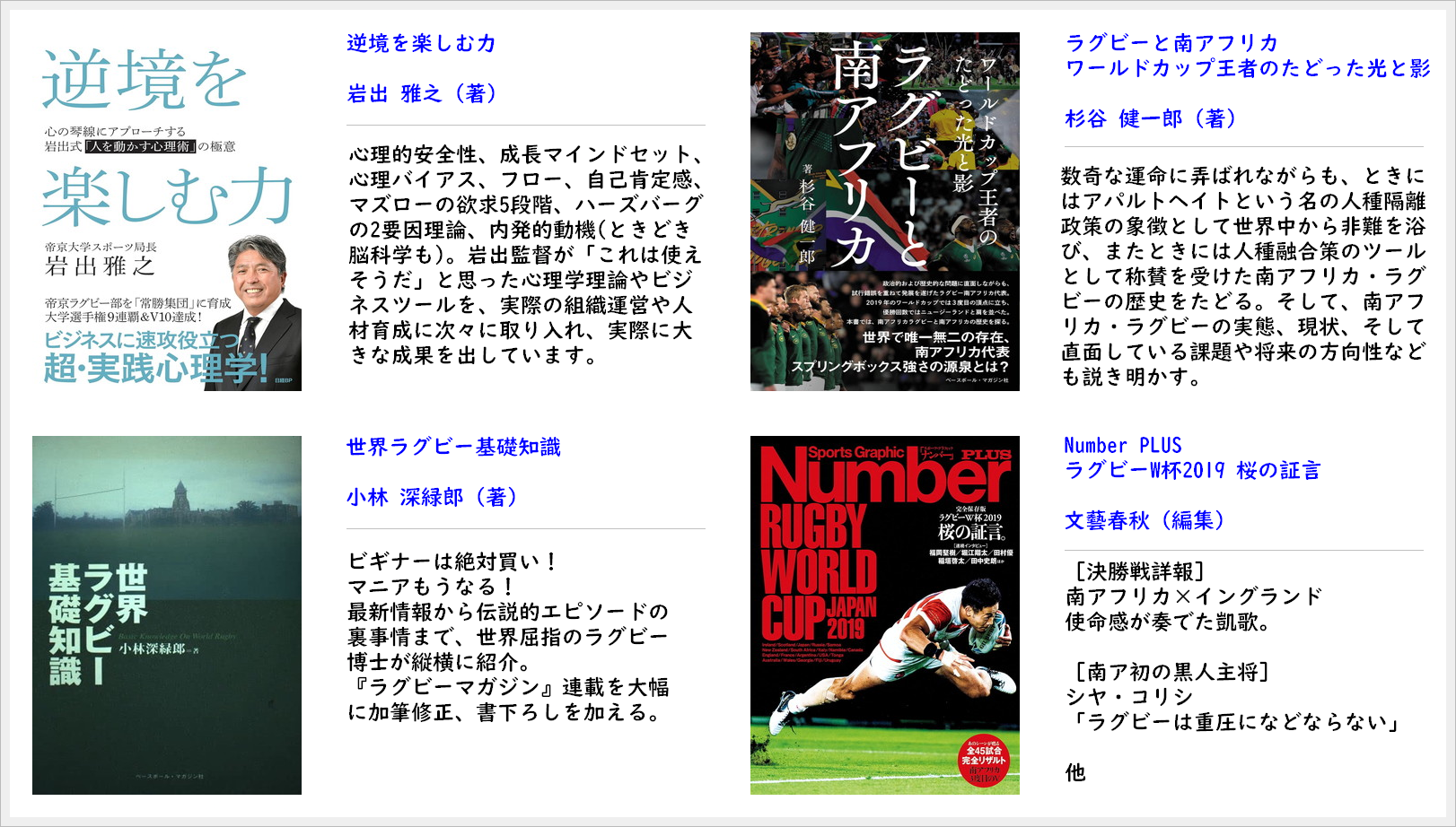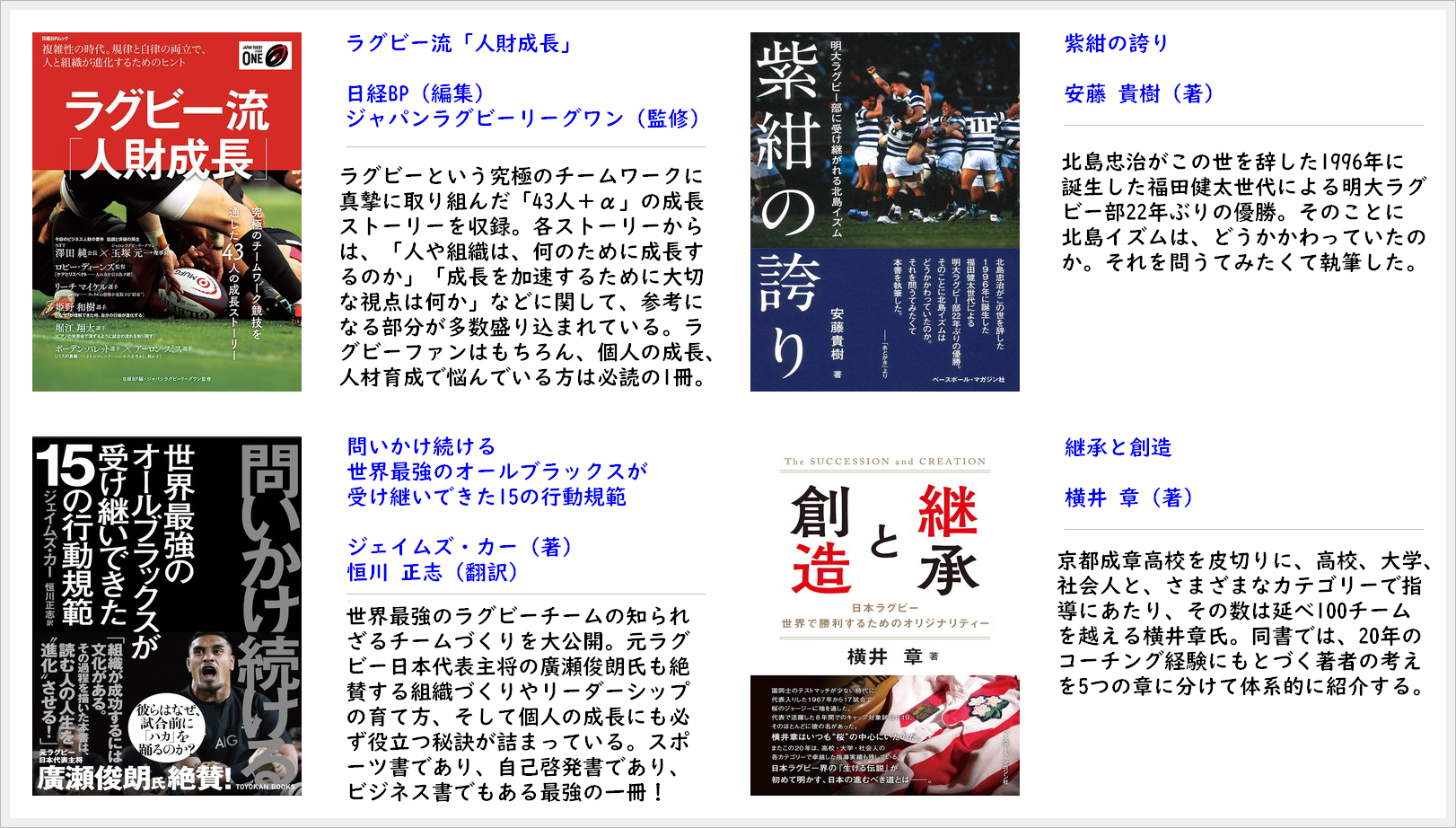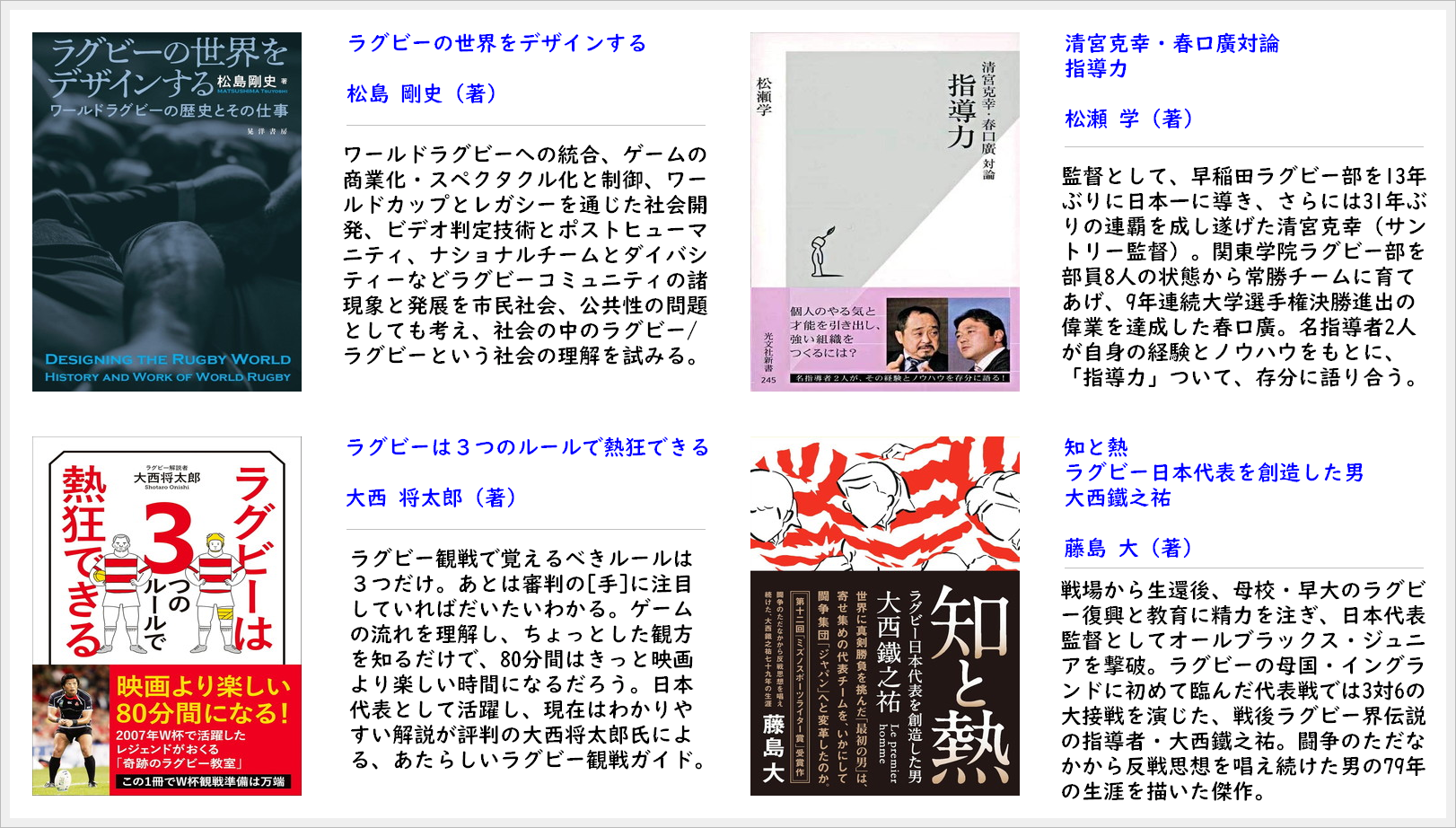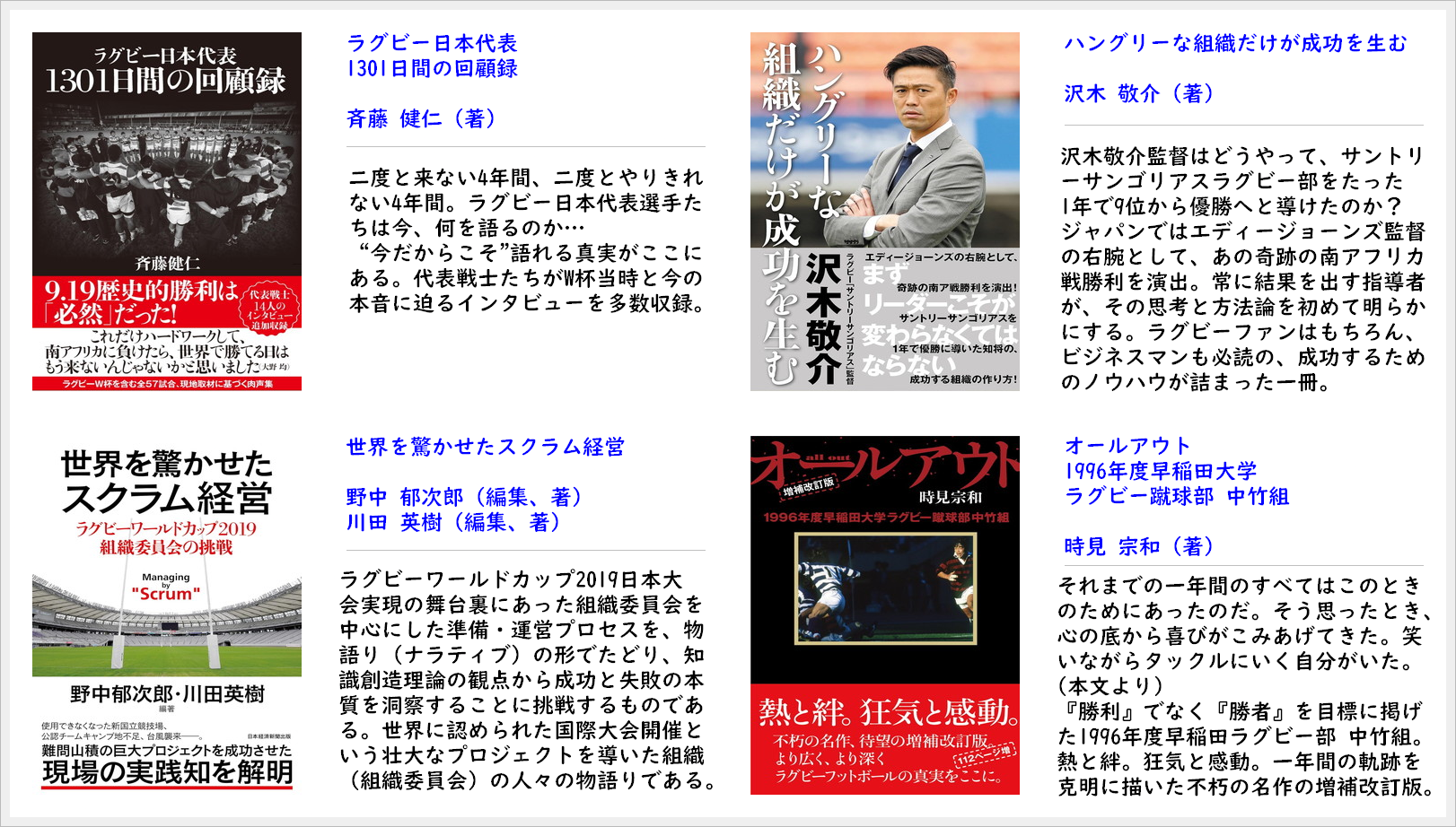 先日、フォロワーさんからDMでおススメのラグビー本について聞かれた時にご紹介した本です。文中にはタイトルだけ記載しましたので、Amazon等で検索する際に使ってください。著者や内容等は画像で確認してください。何かの参考になれば幸いです。