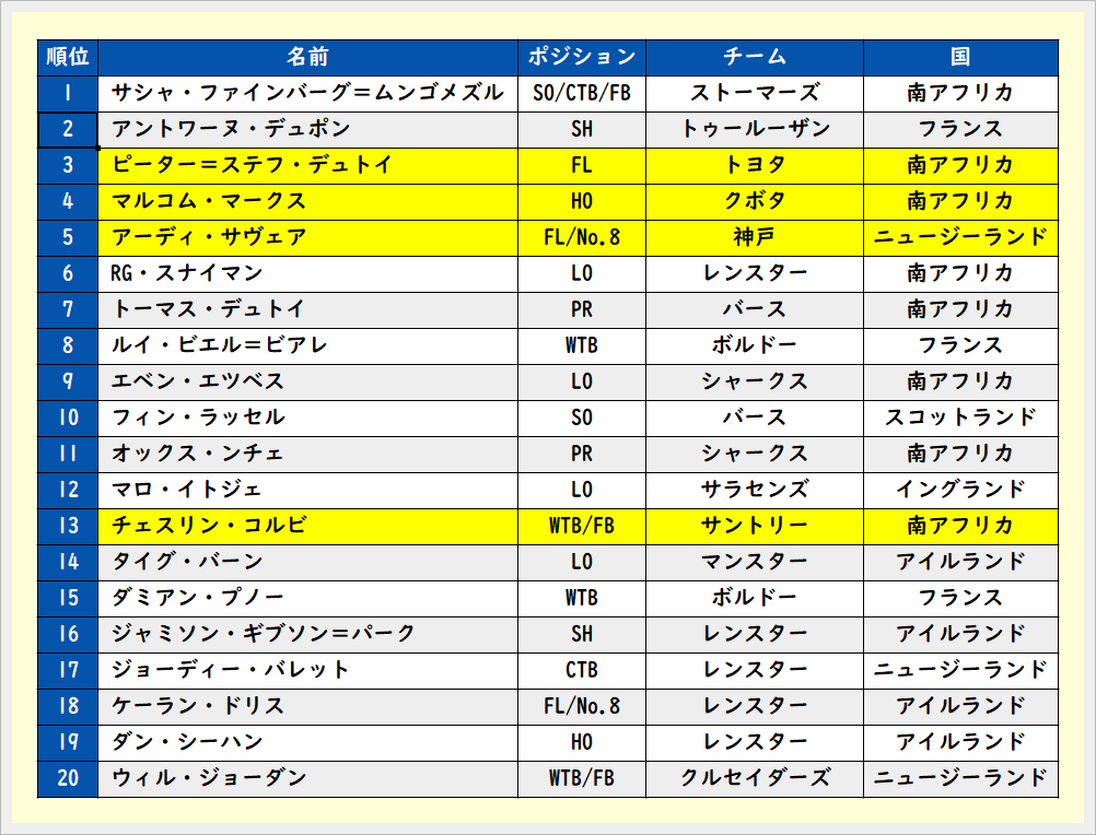 638 2025年男子ラグビー選手TOP100