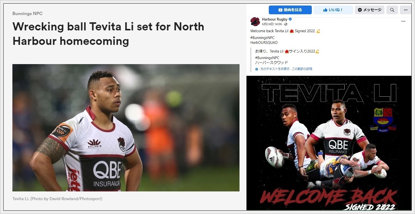 8/5に開幕するNPCに向けてサントリーのテビタ・リーがノースハーバーに復帰するとのこと
