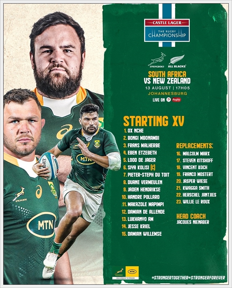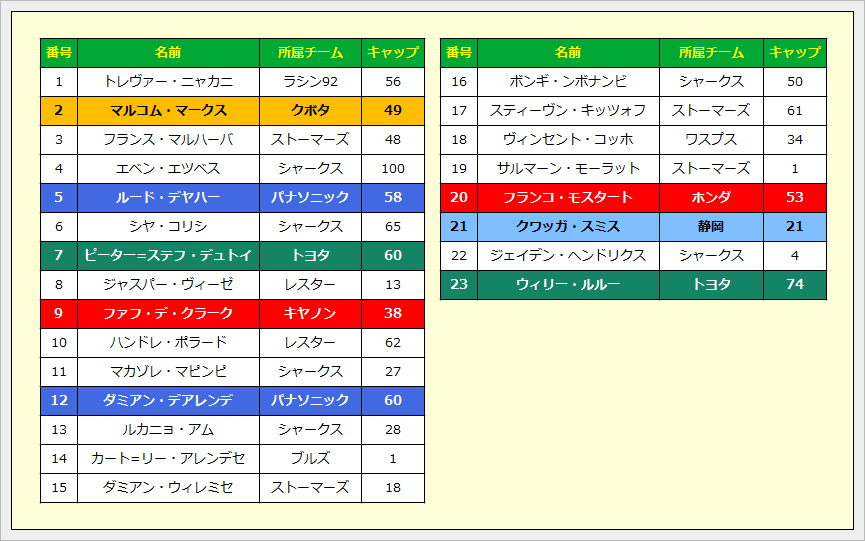 ニュージーランド戦の南アフリカ代表メンバーが発表されましたね