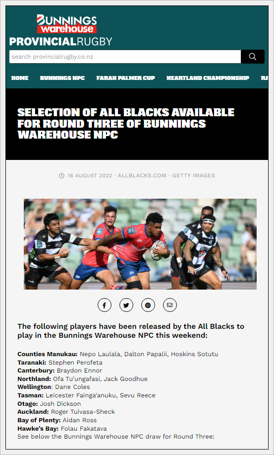 週末のバニングスNPC出場のためにオールブラックスの選手達がリリースされた