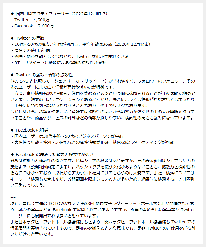 現在、貴協会の SNS での情報展開の手段は Facebook のみですが Twitter でも情報展開していただきたく存じます
