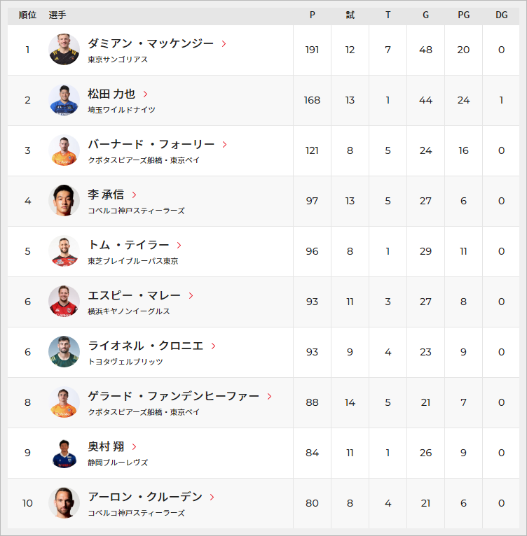 昨季の個人ランキング(得点とトライ数)のおさらいです