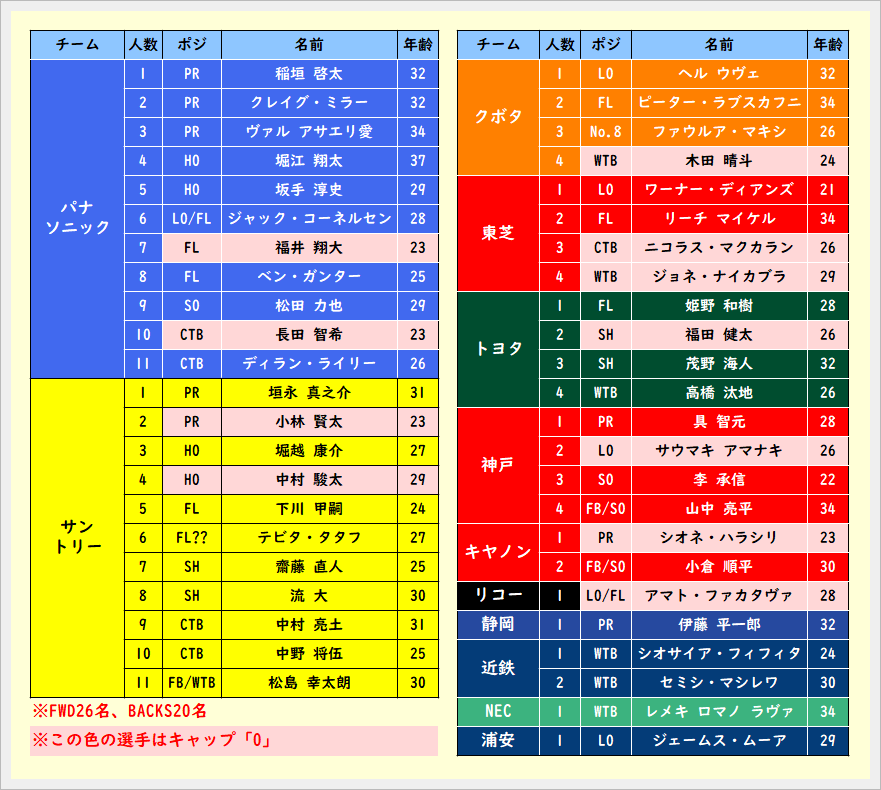 パナ布巻/クボタ末永/サントリー森川/キヤノン嶋田/トヨタ秋山/リコー松橋/三菱重工岩村/近鉄片岡/浦安飯沼/ホンダ近藤/織機南/釜石落...