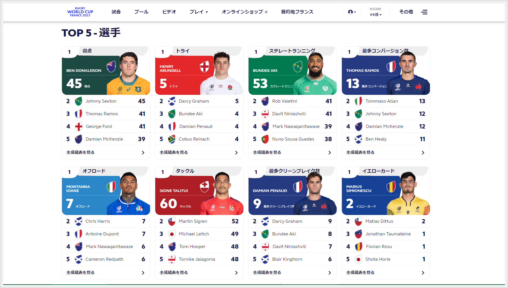 ◆タックル:リーチ3位(49)/コーネルセン10位(44)/ラピース17位(37)/稲垣19位(36)/ファカタヴァ25位(34)