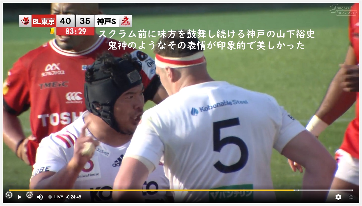 ホーンが鳴って5分間、神戸はPR山下を中心に魂のスクラムを組み続け、東芝DFをまん中に集め大外で仕留め引き分けた