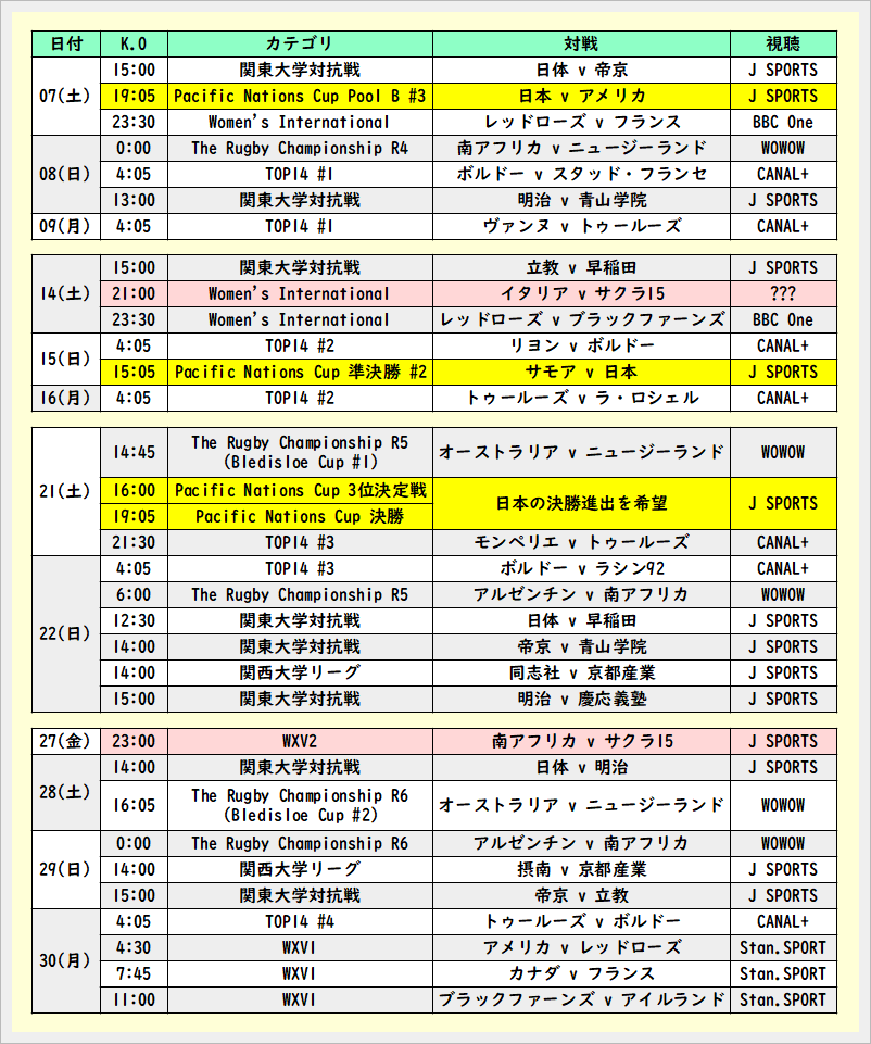 9月のラグビーカレンダー