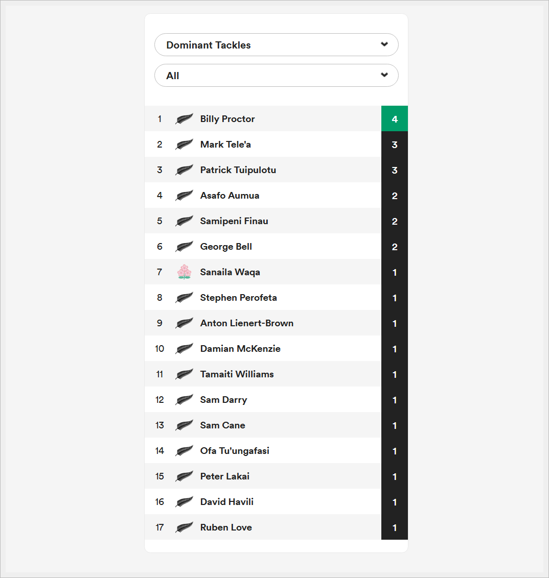 この支配的なタックルは、通常1試合に1チーム5~10回程度でしょうか。画像は日本代表 - オールブラックス戦のものです。こんな両チームに極端な差が出ることは、自分は見たことありません。