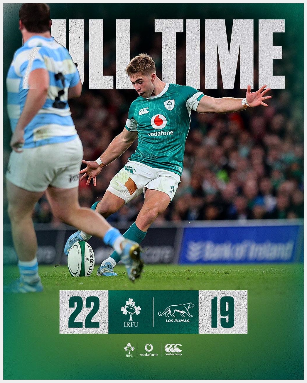 アイルランドはオールブラックス戦での敗戦から立ち上がり、ダブリンでアルゼンチンとの激闘に勝利した。アイルランドは開始10分までに2トライを上げ、ロケットスタートに成功した。アルゼンチンはSOアルボルノスの3つのPGで追い上げるも、アイルランドはLOマッカーシーのトライで前半を 22 - 9 で折り返す。