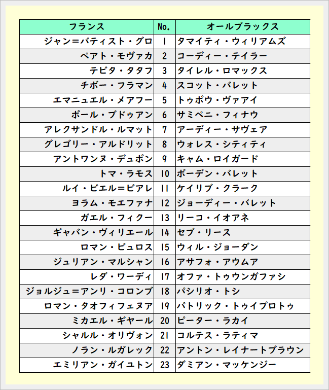そしてオールブラックスのメンバー。イングランド戦で脳震盪を確認された2番コーディーと10番バレットが先発に復帰しました。個人的にはバレット先発でマッケンジー控えの方がしっくりきます。逆にアイルランド戦で脳震盪が確認されたサム・ケインの代わりに6番フィナウが入り、7番にサヴェアが上がり、シティティが8番になりました。これも個人的にはシティティがNo.8が似合うと思っているので嬉しいです。1つ残念なのは、手を負傷した、推しのマーク・テレアが欠場することです。