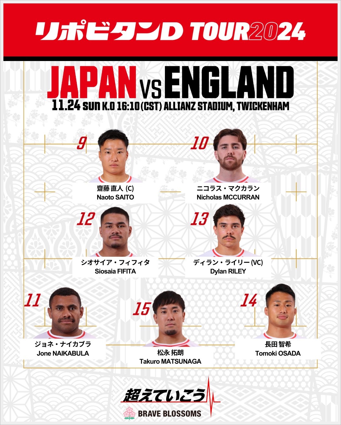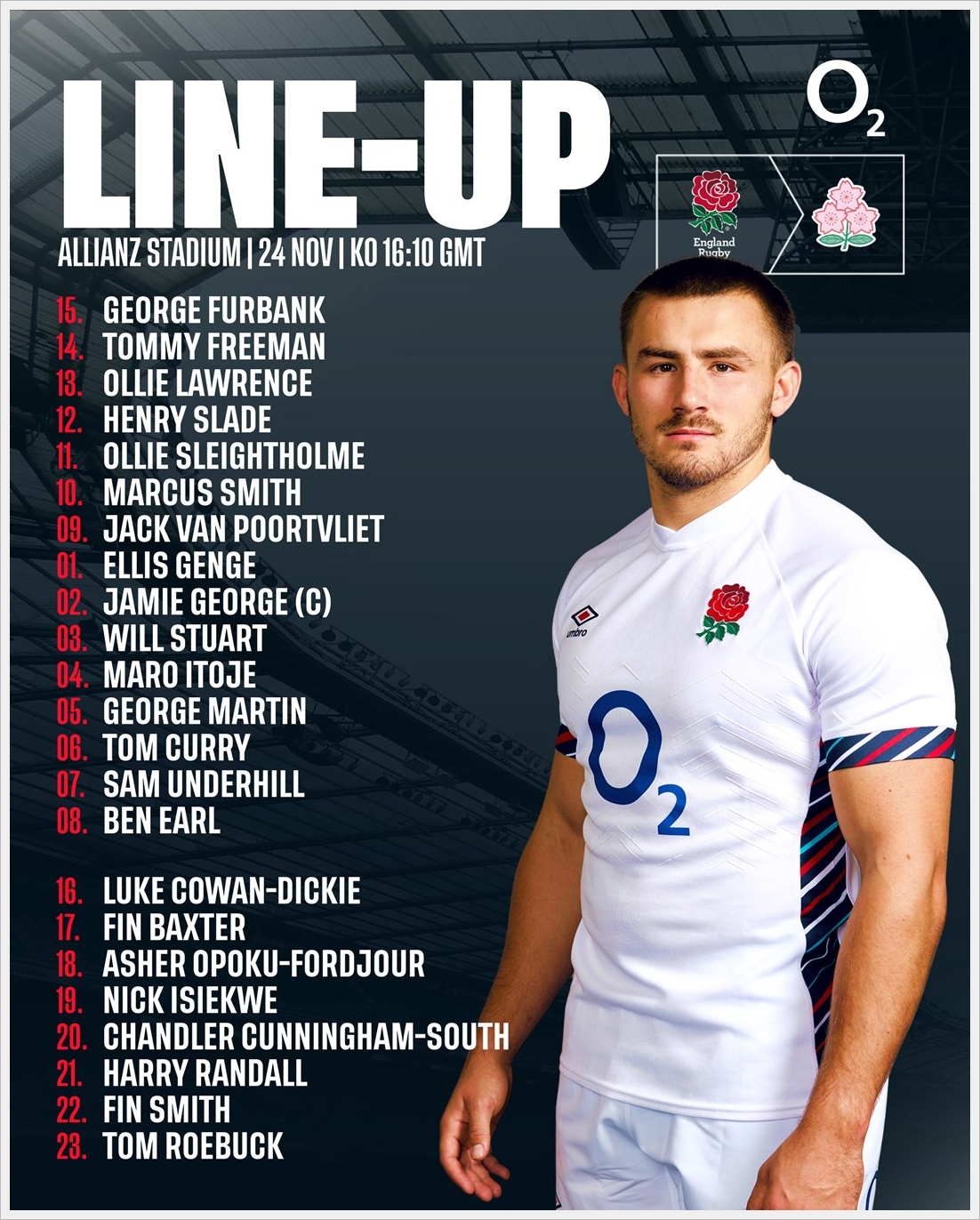 先週の南アフリカ戦とほぼ同じのガチメンバーですね。ガチで来なくても良いのにね(笑)。先週先発だったFLチャンドラー・カニンガム=サウスが控えに回り、脳震盪で欠場だったトム・カリーが復帰ですね。あとはFBフレディス・チュワードの代わりにジョージ・ファーバンクが入りました。先発だけですが、こんな感じです。スミスとマッカランのSO対決も楽しみですね(笑)。