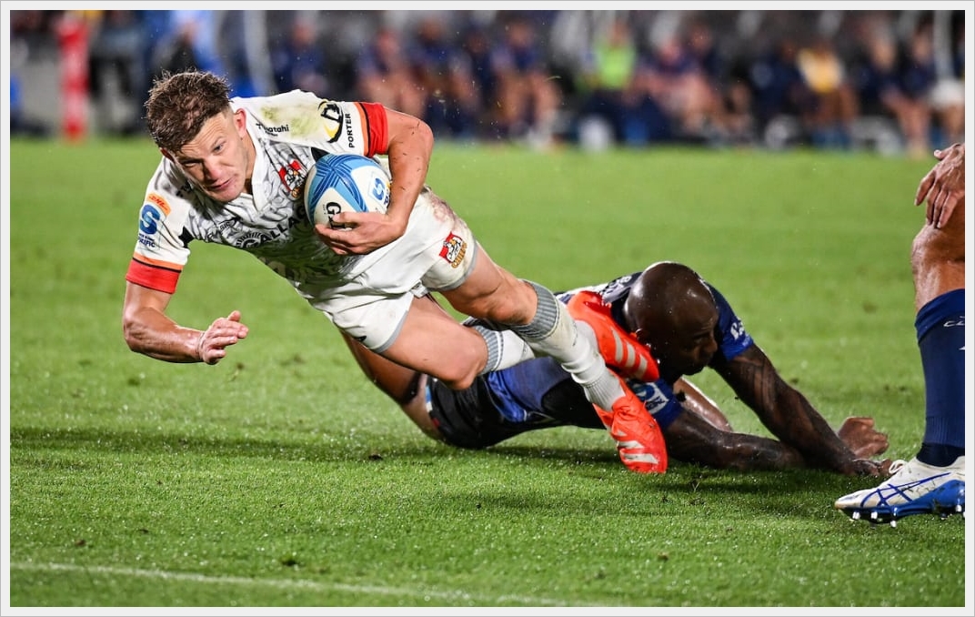 前半はブルーズのペースだった。0 - 3 で迎えた28分、ブルーズのFLダルトン・パパリィがインゴールに飛び込み 7 - 3 と逆転する。チーフスも35分、FBダミアン・マッケンジーがこの日2本目のPGを沈め 7 - 6 と追いすがるも。前半終了間際、またもパパリィがピッチ中央付近で相手ボールを奪取すると、SHタウファ・フナキが素早く右に展開し、CTBのAJ・ラムからWTBマーク・テレアにボールが渡り、シフトアップしたテレアが再びラムに折り返しトライ。前半を 14 - 6 で折り返す。