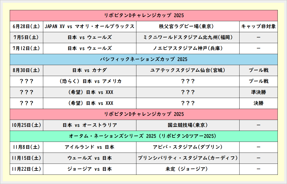 夏の PNC ですが、まだ World Rugby 等のサイトにもスケジュール詳細が載っていませんでしたが、カナダ代表のサイトにはアメリカと対戦の予定が書かれていましたので、恐らく日本とカナダとアメリカが同プールだと思います。