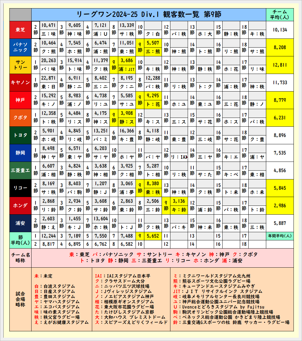 第9節終了時の観客数一覧