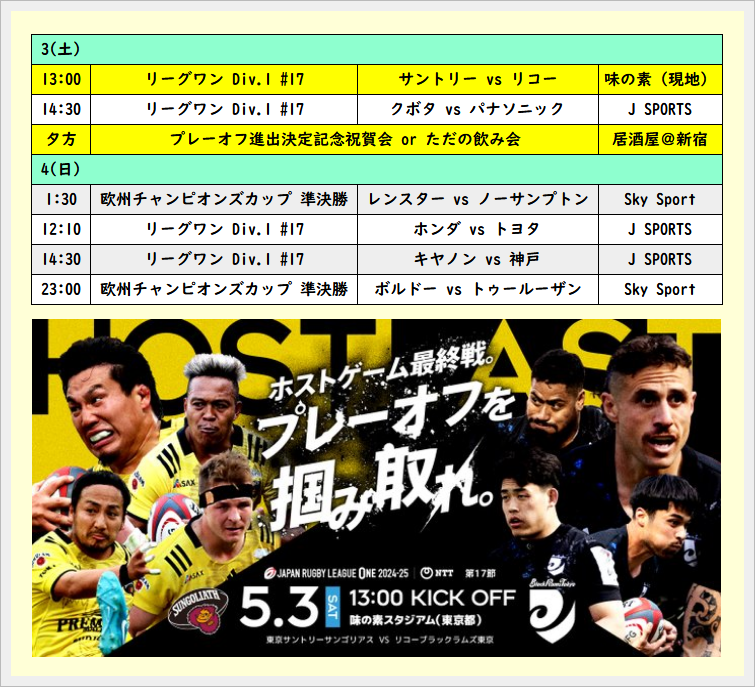 なにはともあれ、開幕に出遅れ、その後も勝ったり負けたりを繰り返したサントリーがプレーオフまであと1歩に迫ったのは嬉しいので、すでに祝杯上げてます。サントリーファンの皆様、まずはおめでとうございました!!