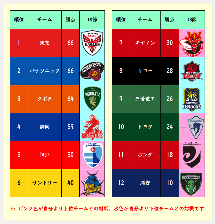 5位神戸/6位サントリー/11位ホンダ/12位浦安