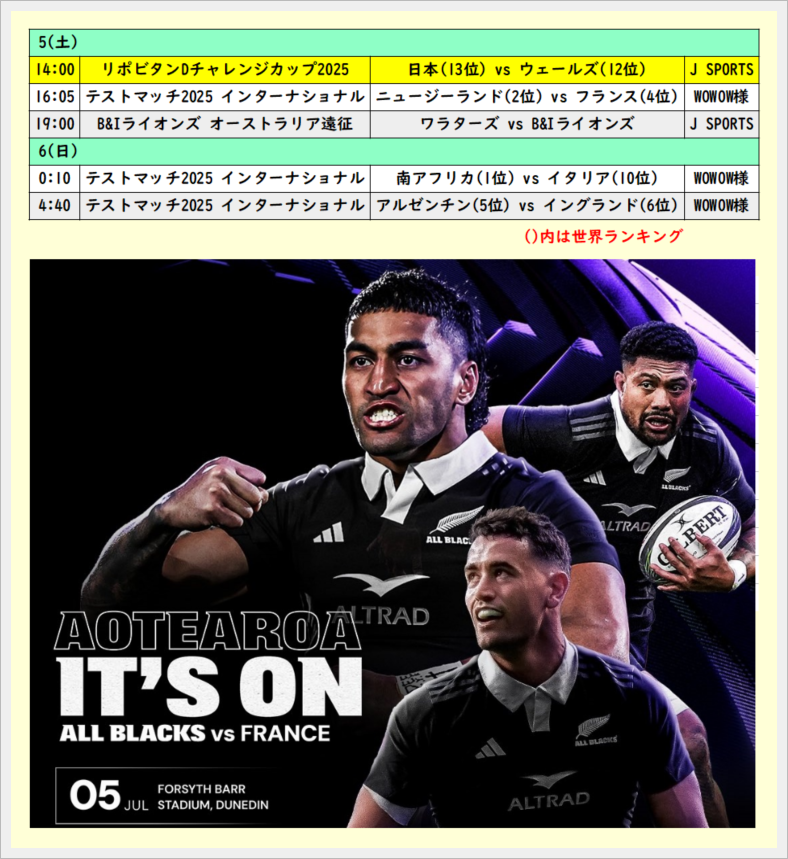 いずれにしろ課題や収穫が多い試合だったと思う。まずは来週もきっちりウェールズに勝つこと。それが最優先だ。同じくらいの力量のチームが2週連続で戦う場合、往々にして1勝1敗になる傾向がある。それは負けた方はきっちり修正し、勝った方が少し満足してしまうからだ。特にこの試合、80分出続けた選手がたくさんいる日本。きっちりリカバリーして来週も頑張れ~。
