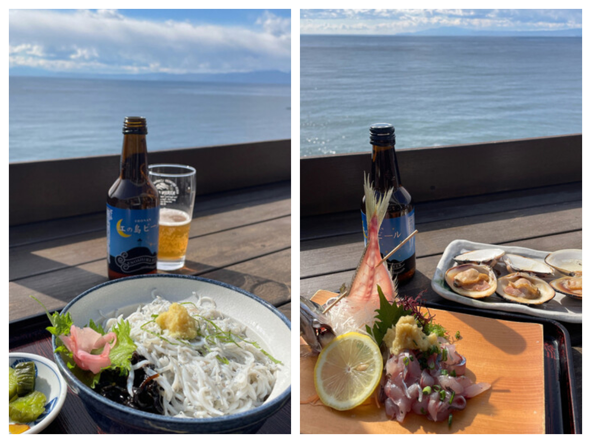 お昼は海鮮が評判のお店へ。お店は島の西に位置してるので、張り出したテラスからの眺望は、遮るものが何もなく、潮風を受けながらビールと海の幸を堪能。