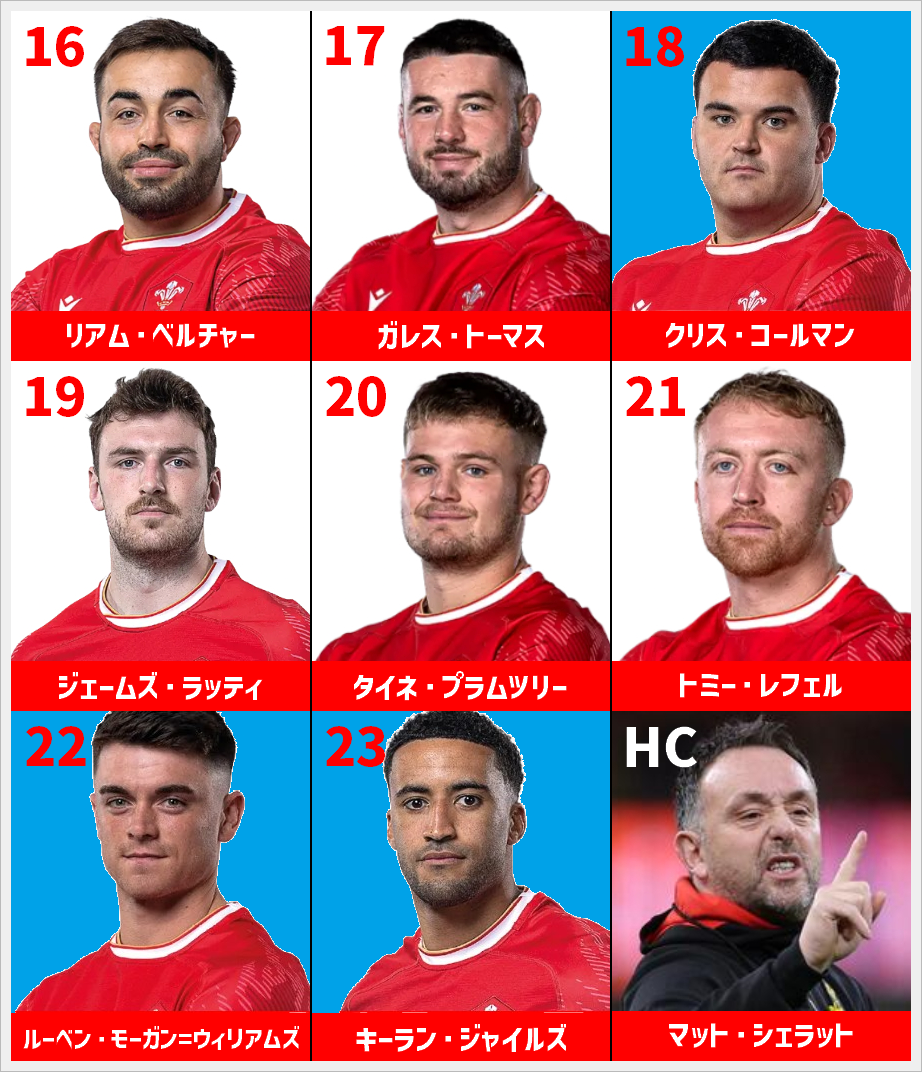 控えはFWD6名+BACKS2名ですのでFWD勝負でしょう。12番トーマスはSOもできます。