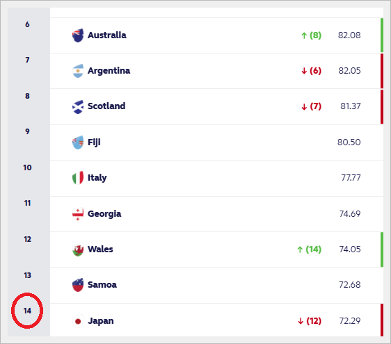 直後のウェールズキックオフ。キャッチした藤原がキックで大きくハーフウェイを超えて陣地を戻す。しかしラインアウトをキープしたウェールズのSHハーディがハーフウェイ手前からハイパント。22m付近でツイタマがものの見事なノッコン。恐らく太陽が目に入ったのだろうがそんなの言い訳にはならない。そしてこのタイミングでボールを追っていた松永が負傷で退場。嫌な流れになる。22m付近のウェールズボールスクラム。ウェールズが左に展開しつつ、誰もいないディフェンスラインの裏にハーディーがキック。WTBアダムスと松永に替わって入ったばかりのFB中楠がインゴールで競り合う。TMOの結果、中楠が故意にボールを叩いたとの判定でウェールズの認定トライ。中楠ももちろんイエロー。中楠はFBも出来るのだろうが、リーグワン出場15試合は全てSOの出場。「何回かやったことがある」のと「上手にできる」とは大違いだ。FBの後ろにキックが飛んでいく時点でポジショニングが浅いと言える。それなら中楠をSOにして、李をFBにすべきだったのではという考えが頭をよぎる。